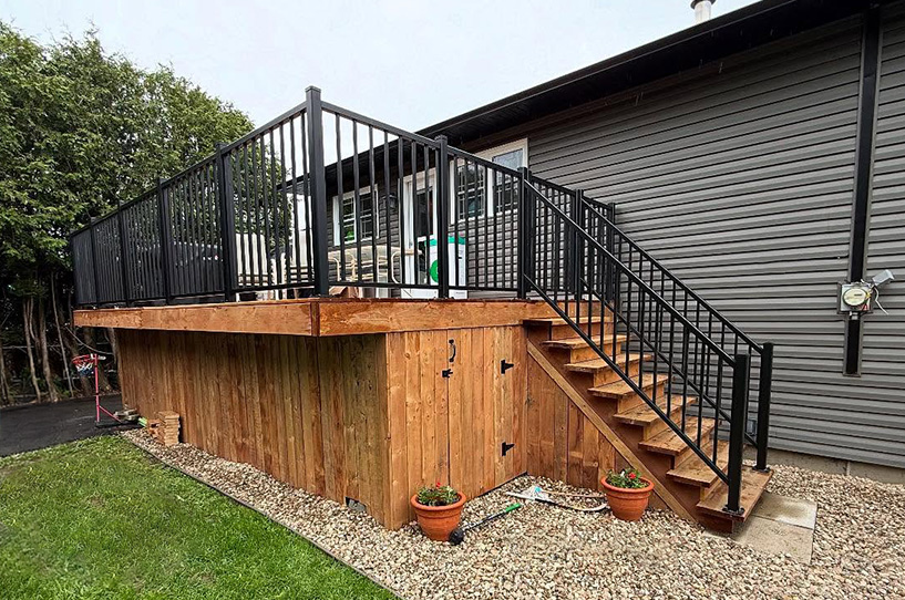 Un patio combinant aluminium et bois est une excellente option pour ceux qui recherchent à la fois durabilité et paix d’esprit. Chez T3M Concept extérieur, nous offrons la fabrication de la structure en bois, qui offre une base solide, tandis que le plancher et les rampes en aluminium assurent une résistance accrue aux intempéries et réduisent l’entretien. L’aluminium que nous utilisons est 20 % plus pur que celui des concurrents, garantissant ainsi une meilleure résistance et longévité. Si vous optez pour un patio avec une structure en bois, il est toujours possible d’ajouter un plancher, des rampes et des limons en aluminium pour augmenter la durabilité de votre installation. Ce mariage de matériaux permet de profiter d’un espace extérieur harmonieux et conçu pour traverser les saisons sans souci.